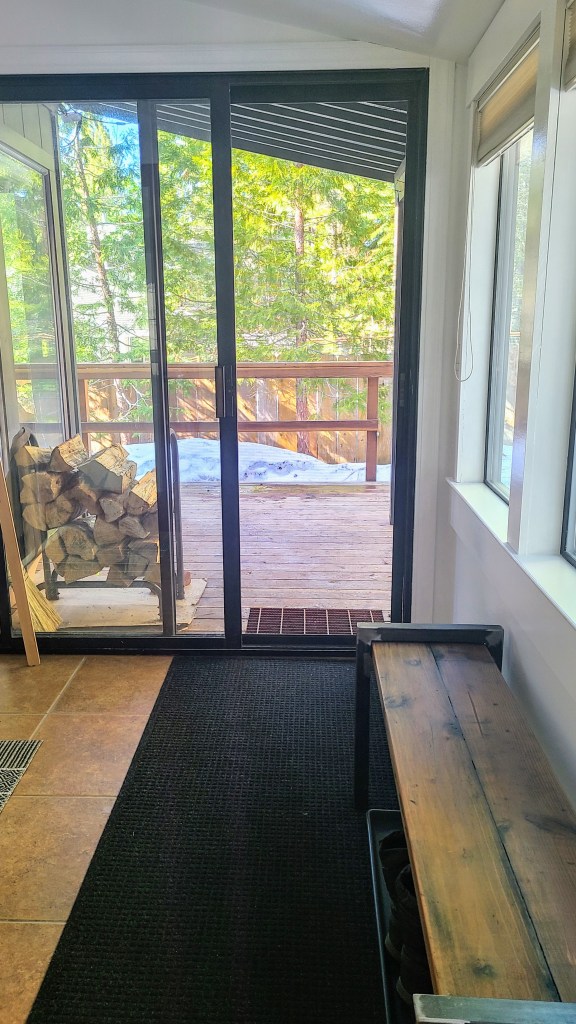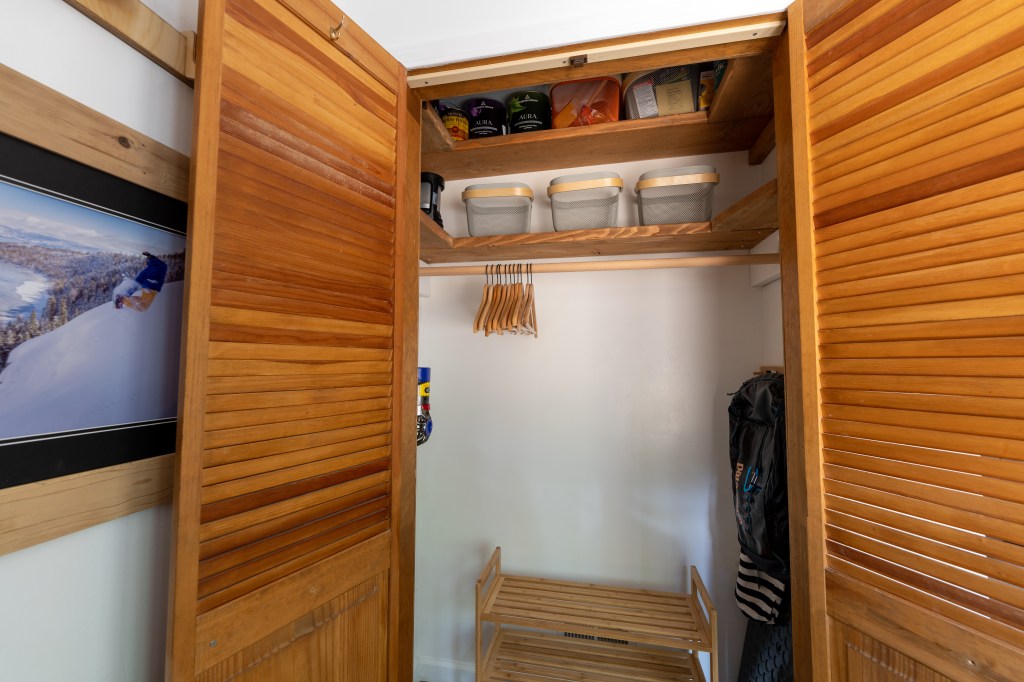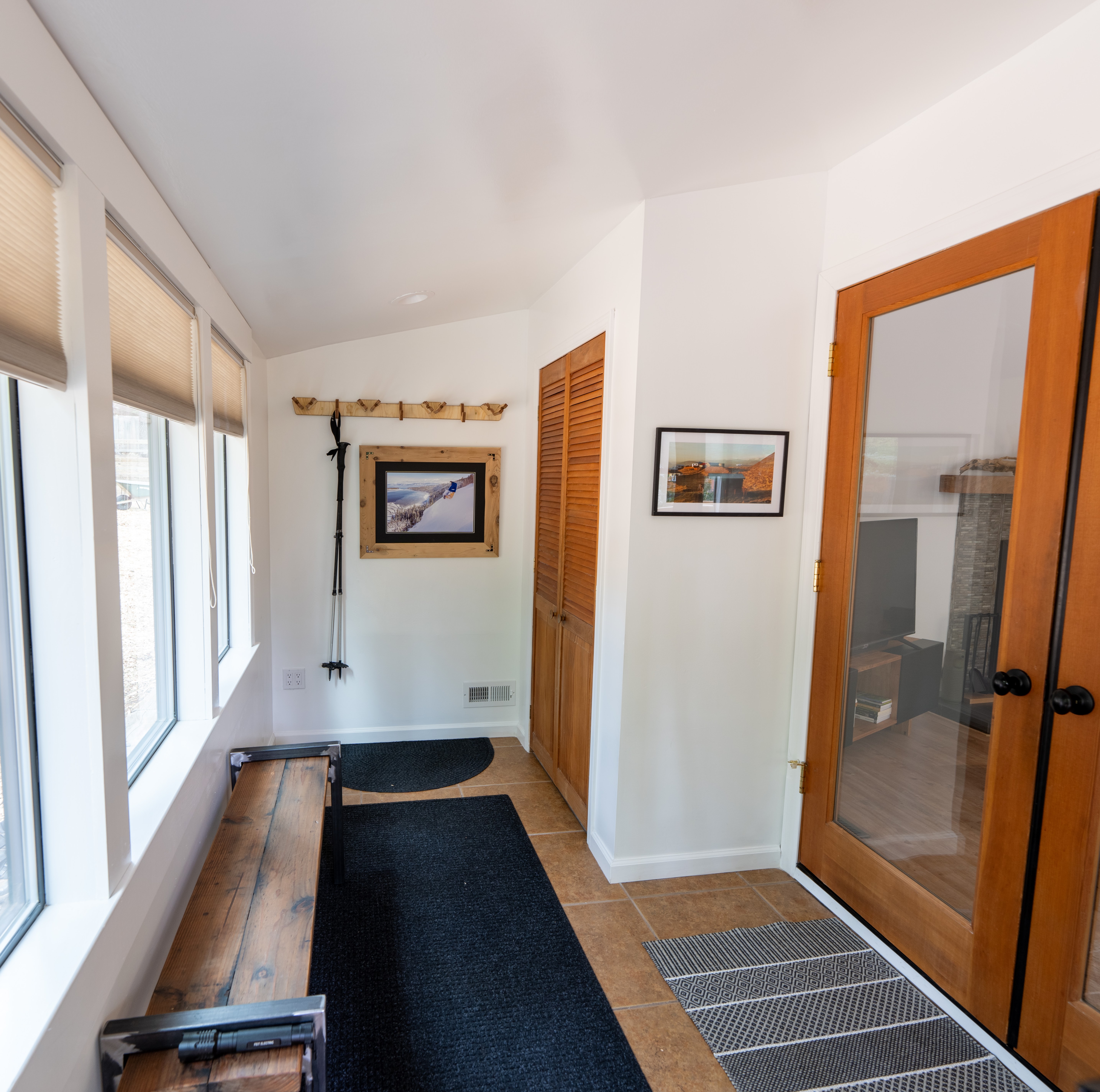 The handmade bench is the perfect spot to pull on or kick off your boots, and the wall rack holds up to four sets of skis and poles — or use it for backpacks and other gear. Additional closet storage keep accessories within easy reach. You’ll find fireplace logs stacked right outside the door.
