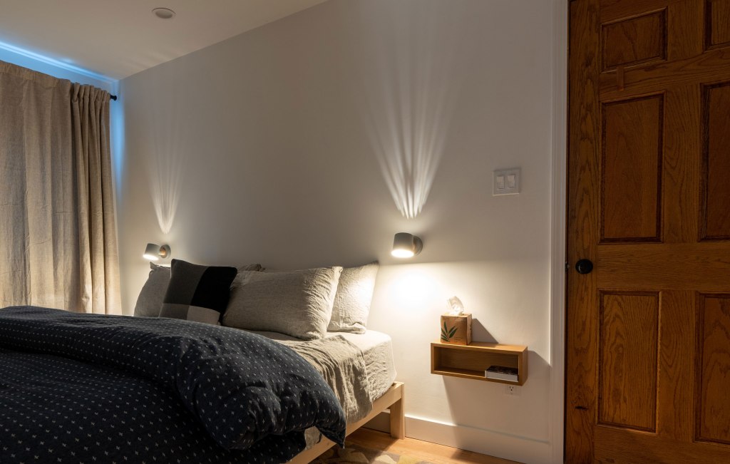 Black-out linen curtains, bedside sconces and an extra-loft wool comforter make this a sanctuary for sleep, while the spacious desk area extends the room’s use. A large walk-in closet is all yours to fill. The sliding glass door leads to a deck with a woodland view — perfect for morning coffee when it’s not covered in snow.