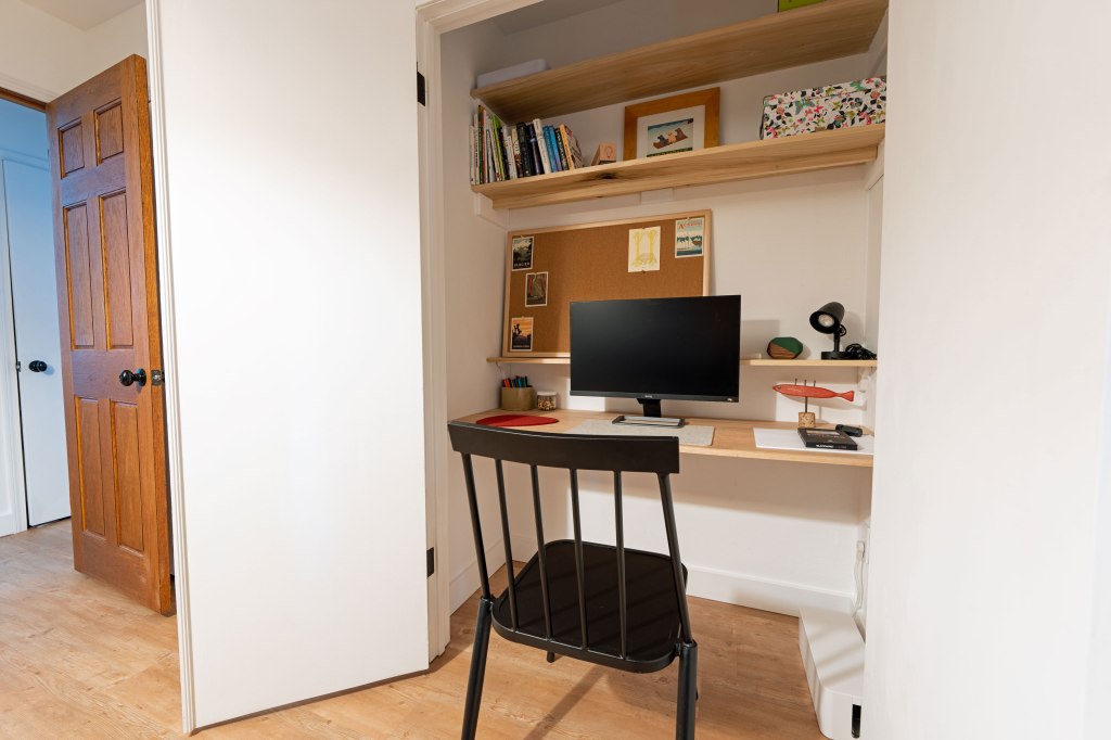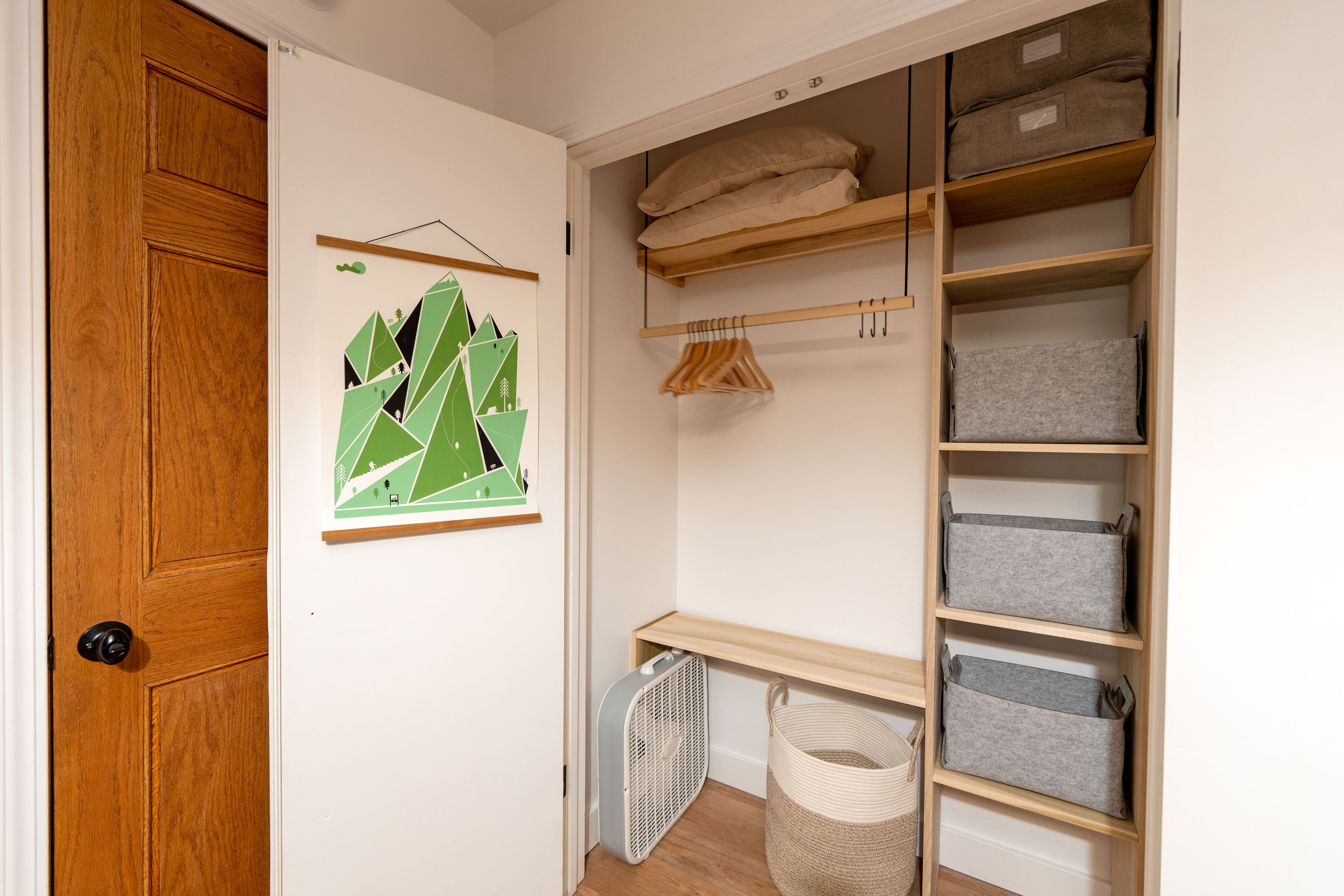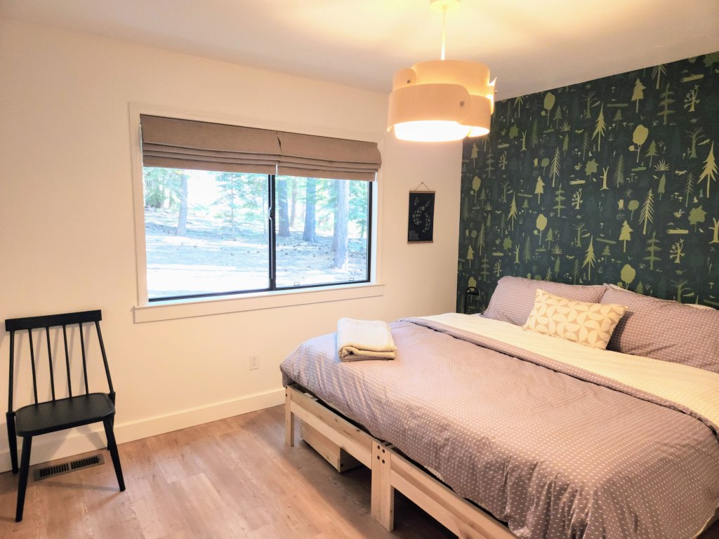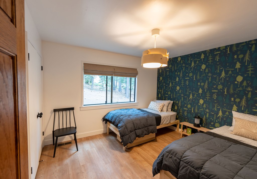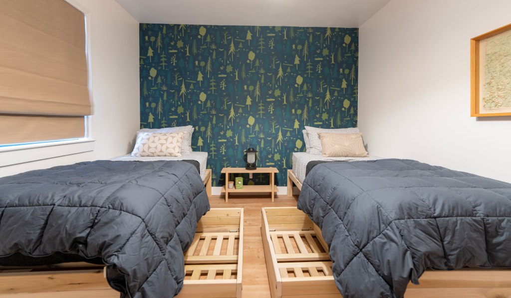 Designed for all ages! Two extra-long twin beds easily convert to a king, and a hidden built-in desk is suitable for work or play. Hand-screenprinted wallpaper from Portland’s Makelike studio provides a cozy backdrop, mirroring the quiet woodland outside.